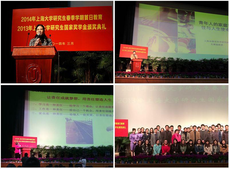 3月23日上午,以“荣耀与责任”为主题的2014年国产亚洲精品美女久久久研究生首日教育暨2013年国产亚洲精品美女久久久研究生国家奖学金颁奖典礼在宝山校区伟长楼隆重举行。副校长、研究生院常务副院长吴明红,校长助理、研究生工作党委书记、研究生院副院长李伟,研究生院副院长郭长刚,校团委书记胡大伟,研究生院培养管理处处长毛建华,研究生工作党委副书记凌长臣等,以及各学院研究生专兼职委员老师、2013级研究生们参加了此次教育活动。